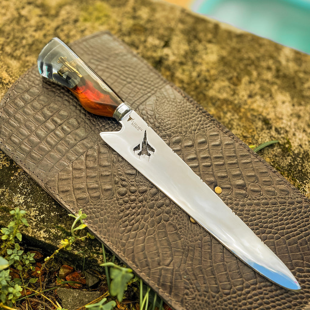 A Faca Aviador foi projetada para aqueles que sempre querem mais – mais estilo, mais precisão e mais exclusividade. Uma peça perfeita para quem leva a paixão pela aviação para todos os aspectos da vida, inclusive para o churrasco e a cozinha.