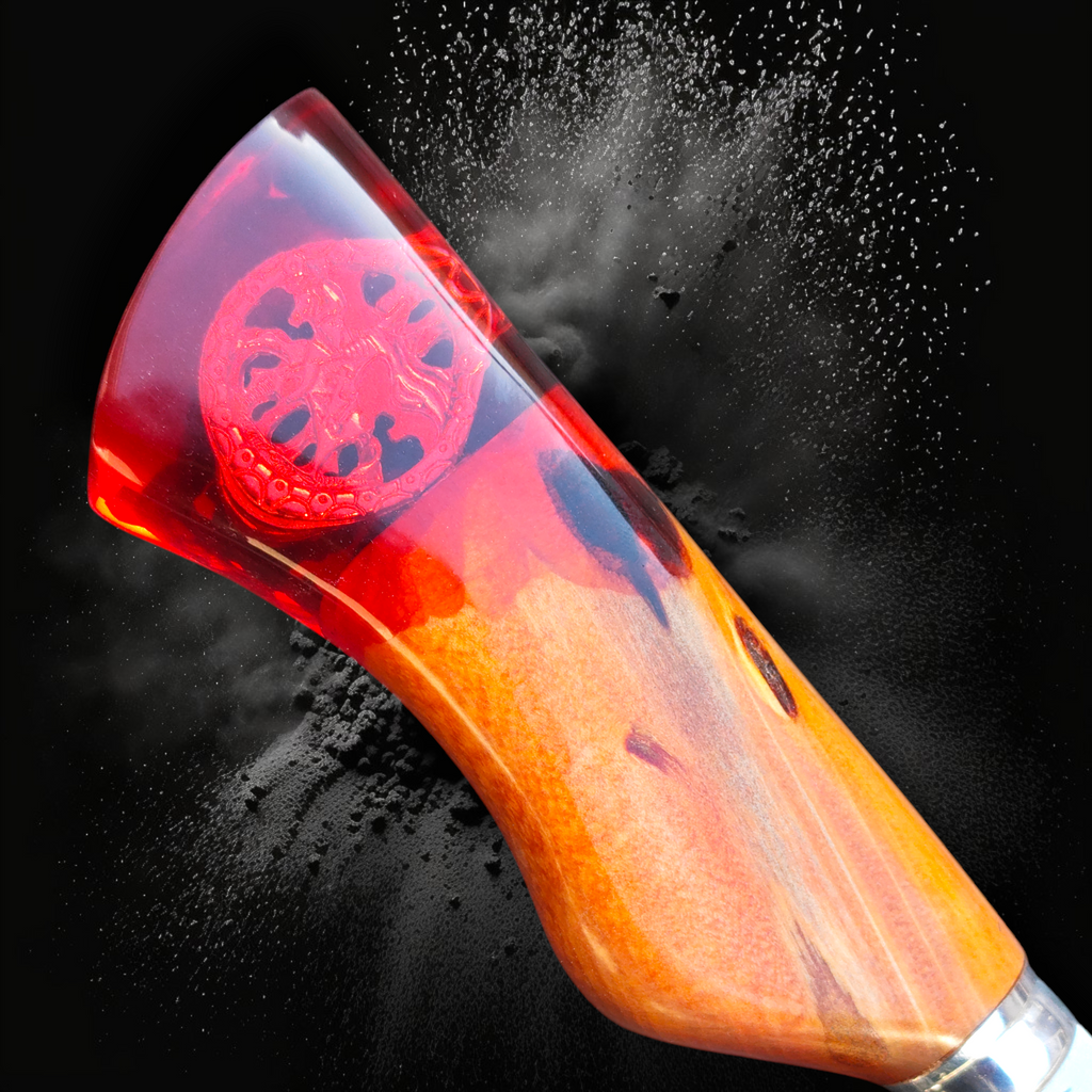 Cabo híbrido em madeira de lei e cristal líquido, contendo a imagem flutuante de São Jorge Guerreiro