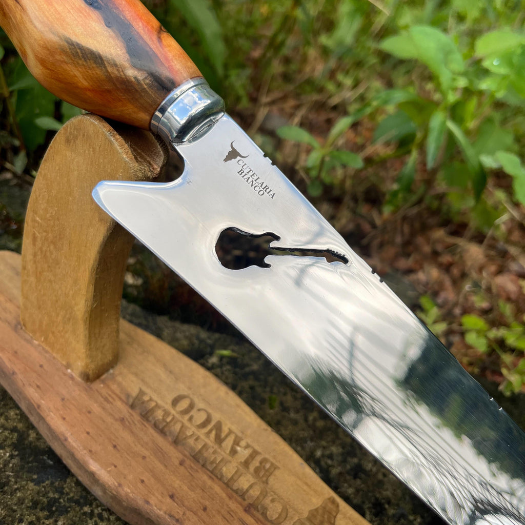 - Desempenho e Estilo: Não é só uma peça bonita – essa faca foi projetada para oferecer cortes precisos e um design robusto. Leve o rock para o churrasco e surpreenda em cada corte.