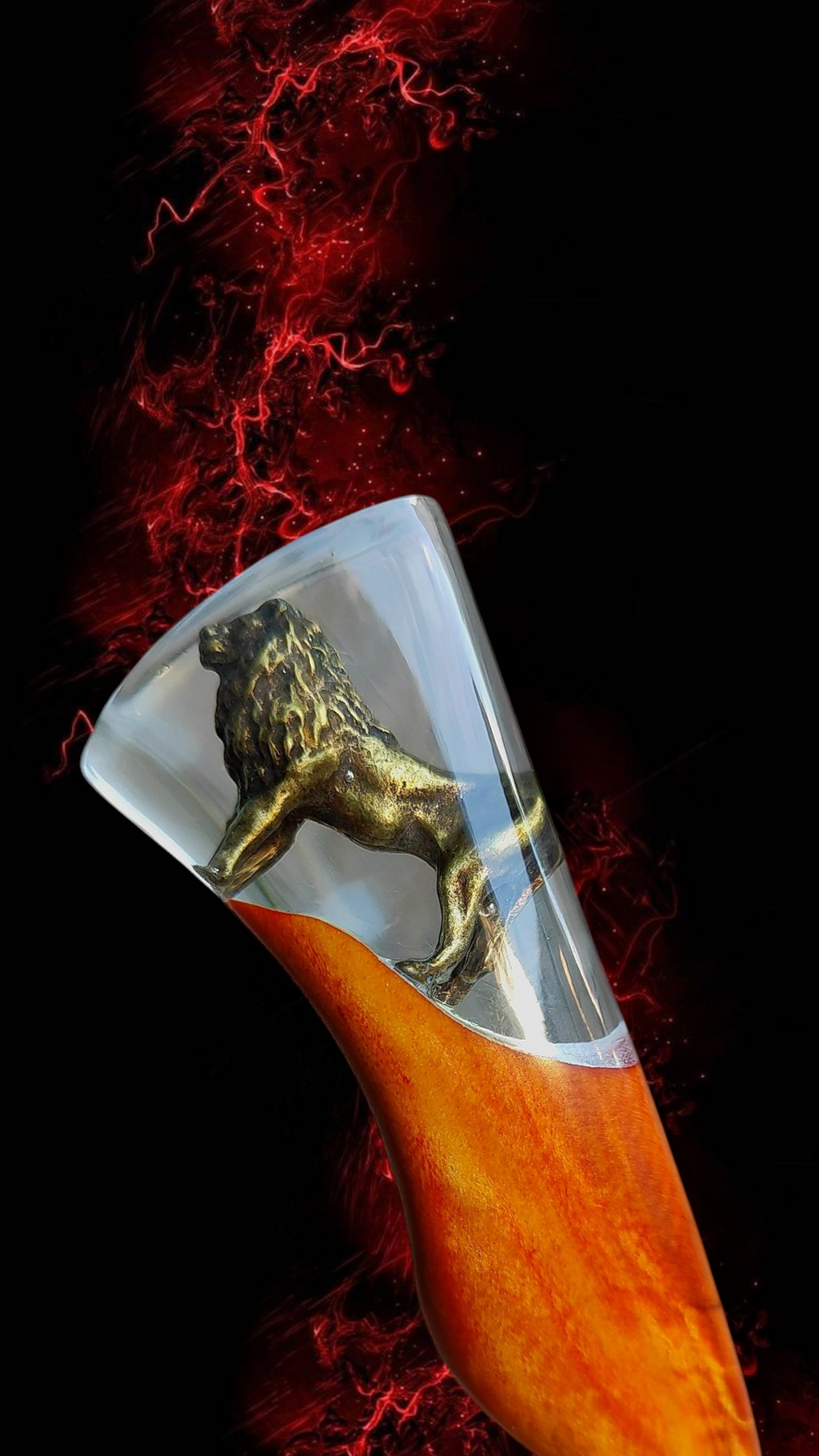 O cabo combina em rara madeira de lei brasileira e cristal líquido Italiano, abrigando um pingente flutuante de leão, feito sob medida para essa coleção.