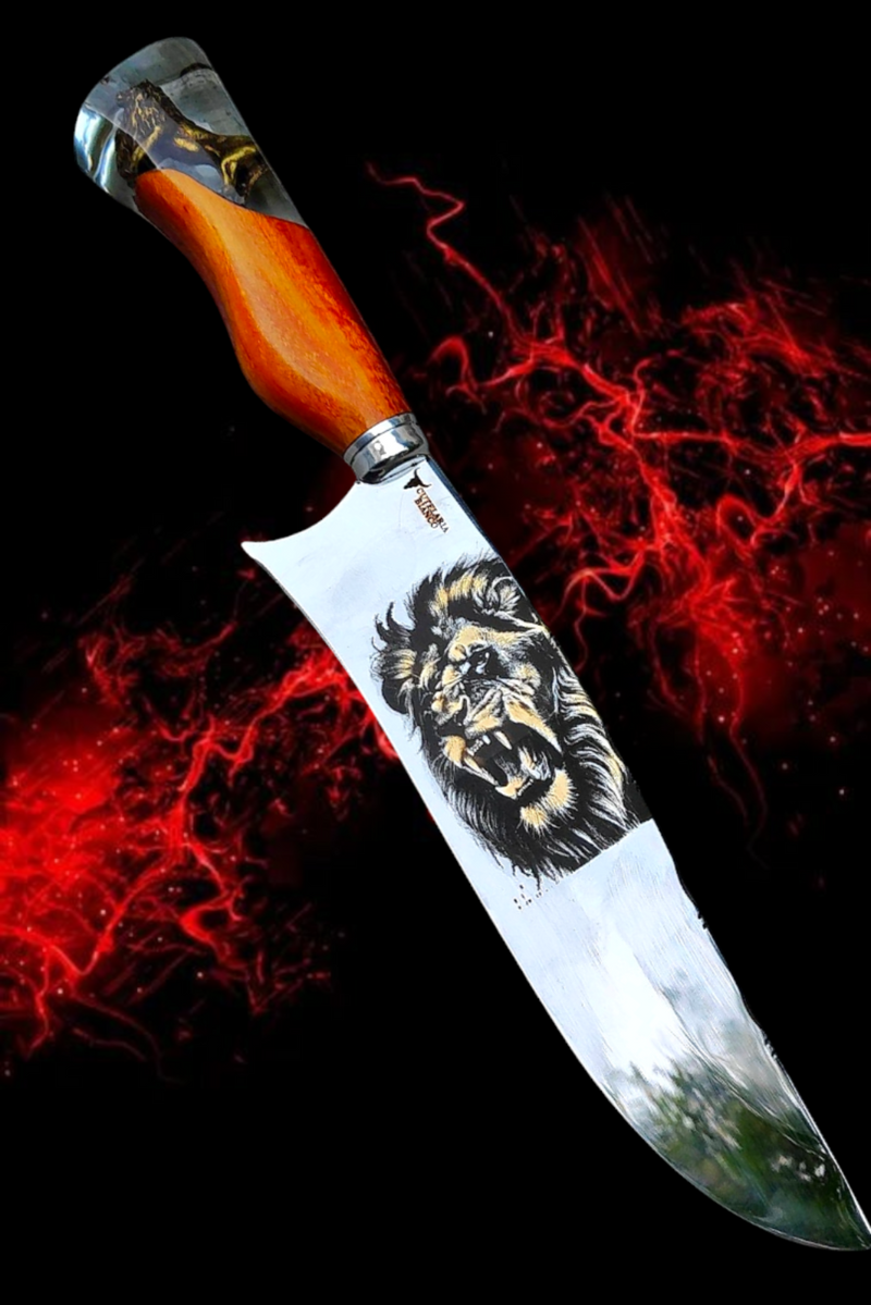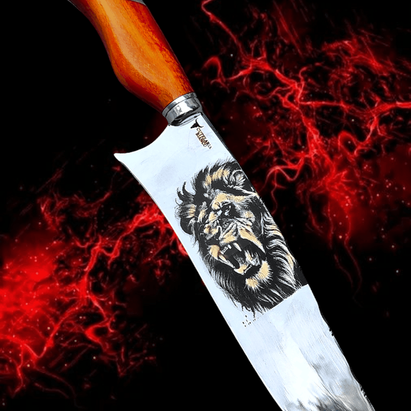 Seu design imponente começa na lâmina larga, forjada à mão com acabamento exclusivo em micropontilhado artístico, onde a imagem de um leão — símbolo universal de poder — ganha vida em banho de ouro 24k.