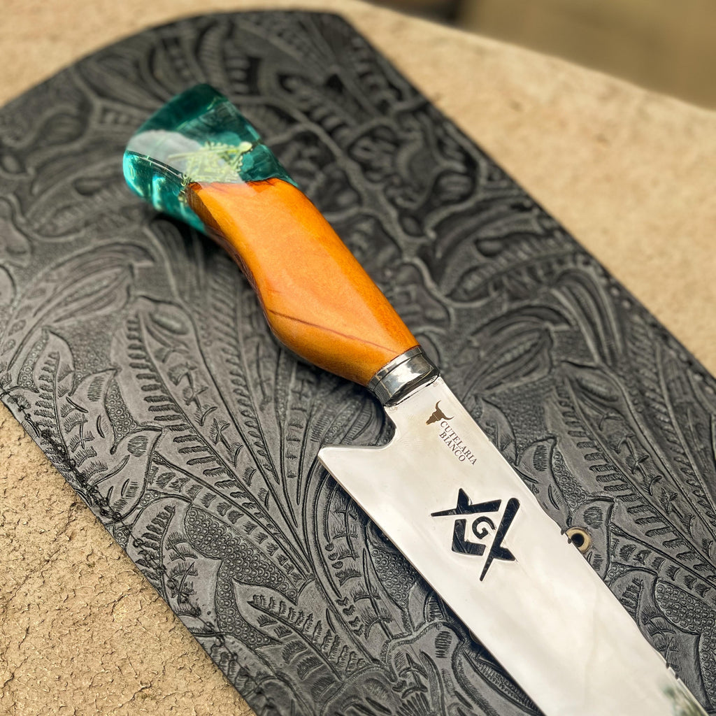 - Cabo em Cristal Líquido com Pingente Exclusivo: Feito à mão pelo mestre cuteleiro Bianco, o cabo oferece uma estética única a cada faca personalizada.