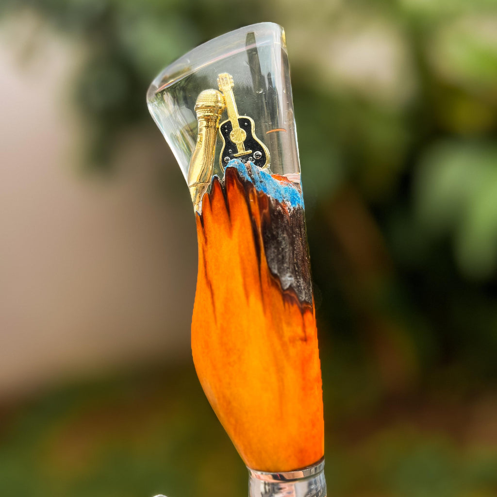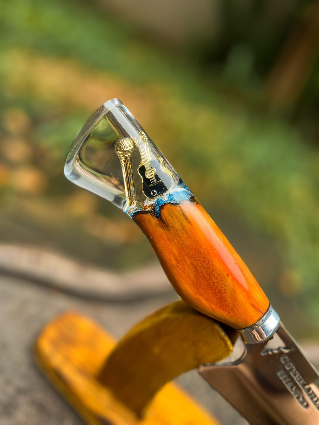 Cabo Elegante em Cristal Líquido e madeira de lei: O cabo combina madeira de alta qualidade com cristal líquido importado, exibindo detalhes temáticos que capturam a luz e o olhar.