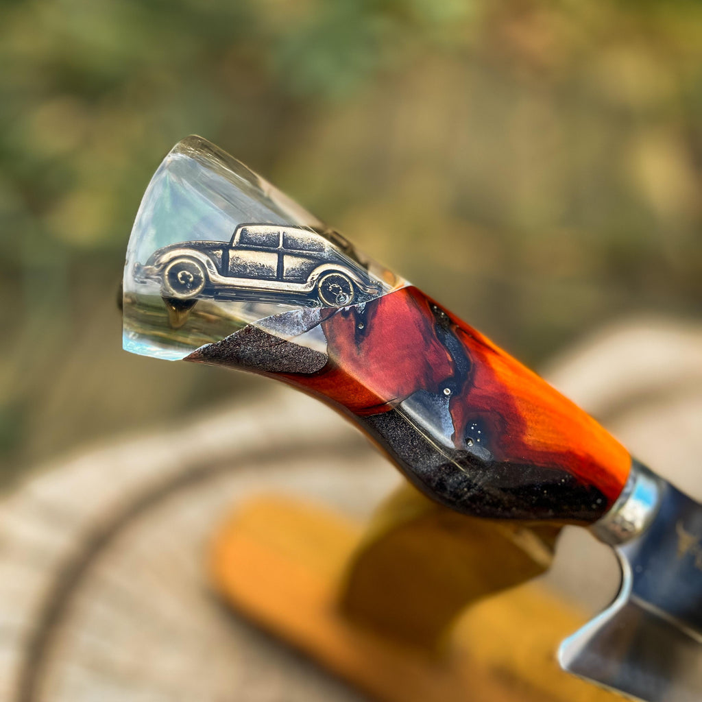 Um destaque desta faca é seu cabo, uma obra-prima que combina materiais de alta qualidade com detalhes inspirados no mundo dos carros clássicos, adornado por elementos que remetem ao icônico Fusca. Esta combinação não só oferece um toque de sofisticação e exclusividade, mas também assegura um manuseio confortável e seguro, refletindo o espírito aventureiro dos aficionados de carros clássicos.