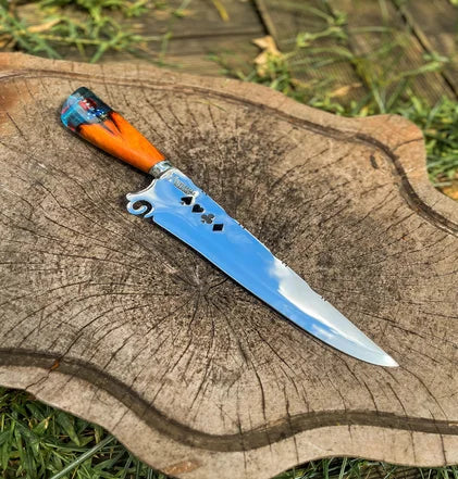 Design Distintivo com Naipes: A lâmina é adornada com naipes vazados, conferindo a esta faca uma identidade única e um toque de sofisticação.