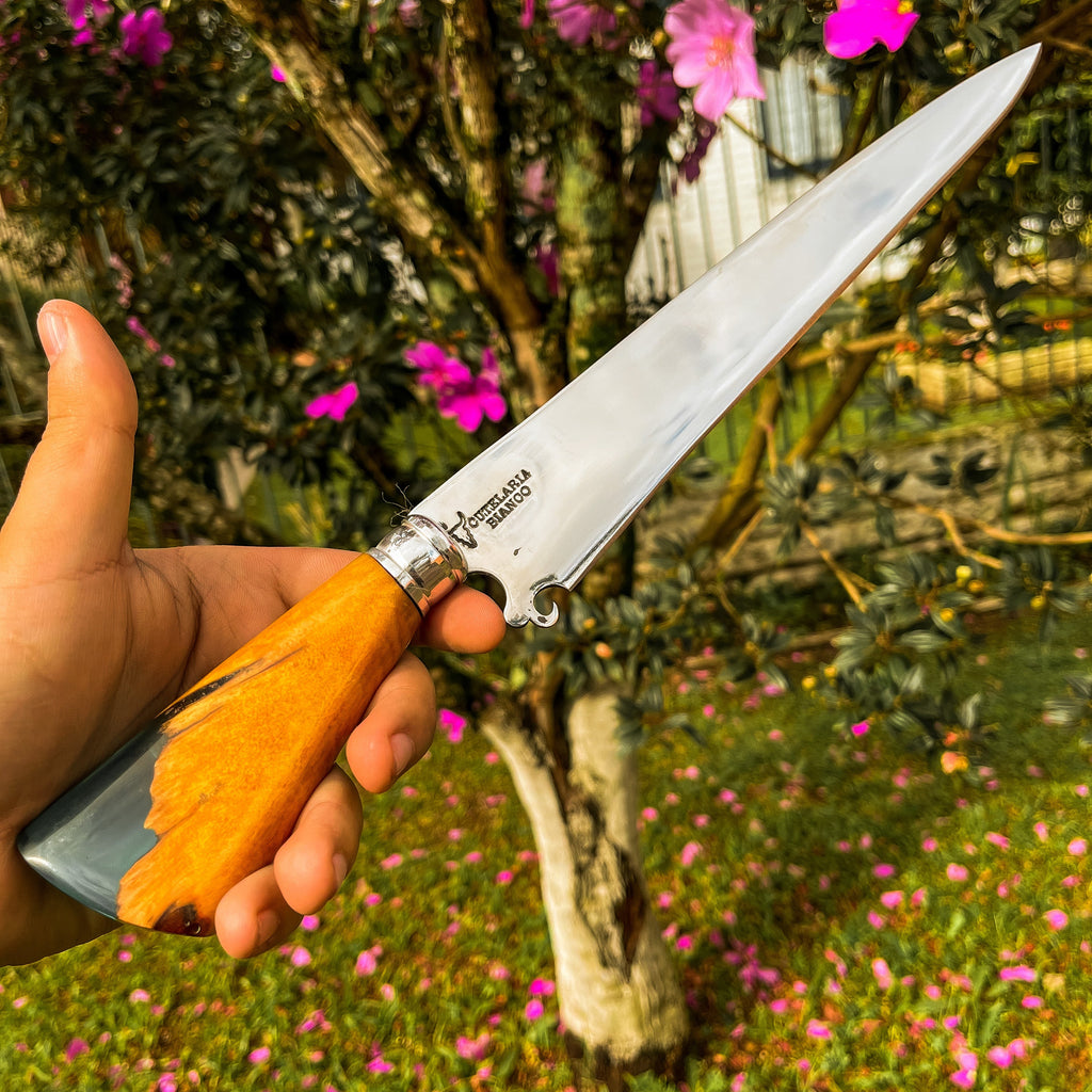 - Corte Preciso e Personalizado: A faca do kit, com lâmina de 10 polegadas própria para churrasco, oferece um corte limpo e eficiente. O cabo, assim como nas outras peças, vem em cristal líquido e madeira, com a opção de escolher a cor que mais combina com seu estilo.
